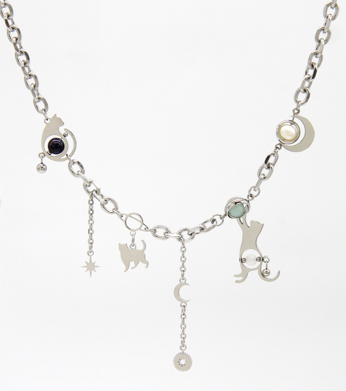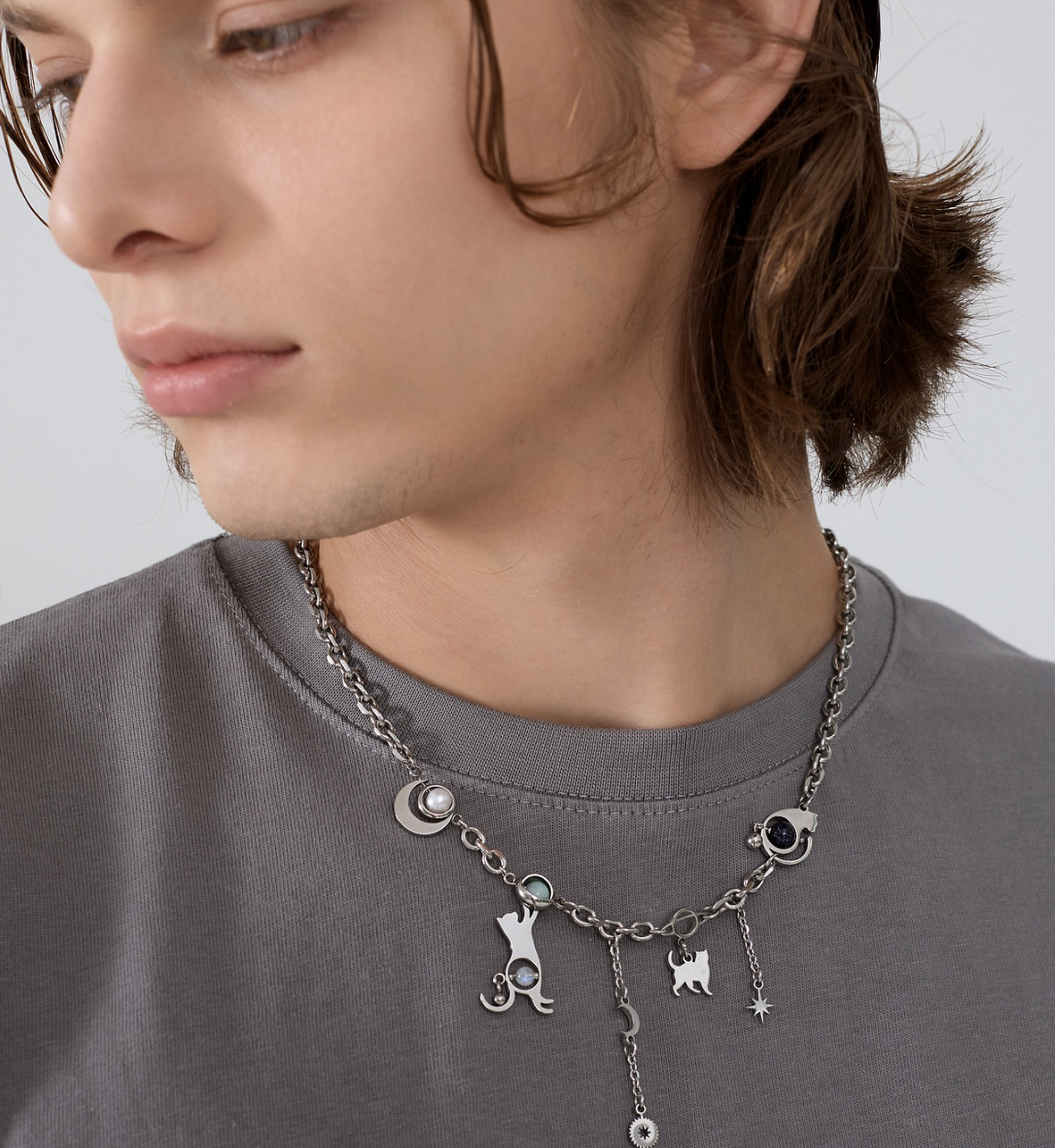 「LunaWhisker」 全系列以簡約的線條中藏著流動的節奏與生命力,宛如貓咪在夜色中輕盈穿梭,優雅卻難以捉摸,適合任何性別佩戴,彰顯自我風格。將不銹鋼的現代質感與天然礦石、珍珠的璀璨光芒,打造出一個年輕又神秘且充滿靈動能量的質感首飾系列。