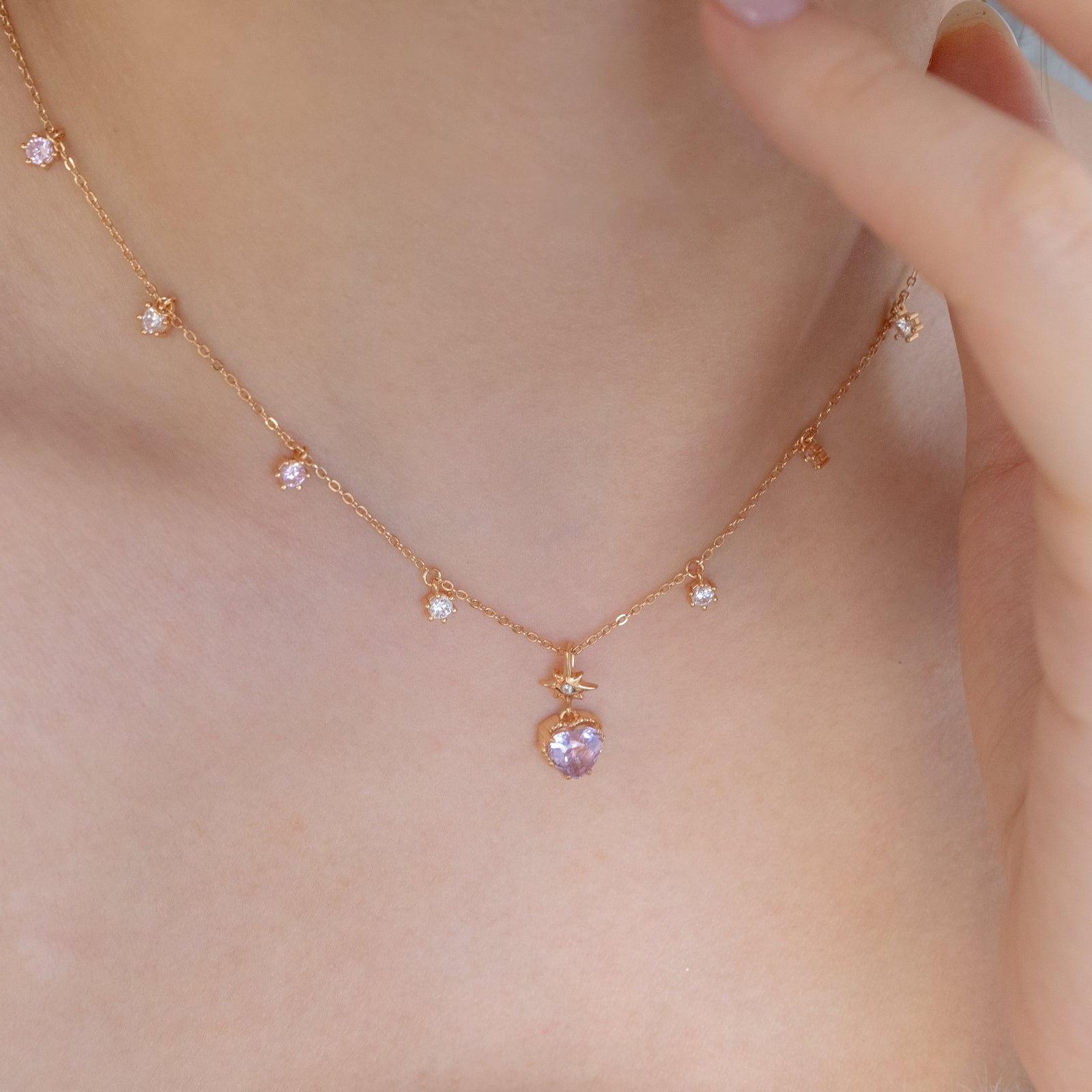 Heart-shaped lavender necklaces in the Valentine collection radiate warmth and affection, showcasing delicate pink tones that evoke feelings of love and serenity.
