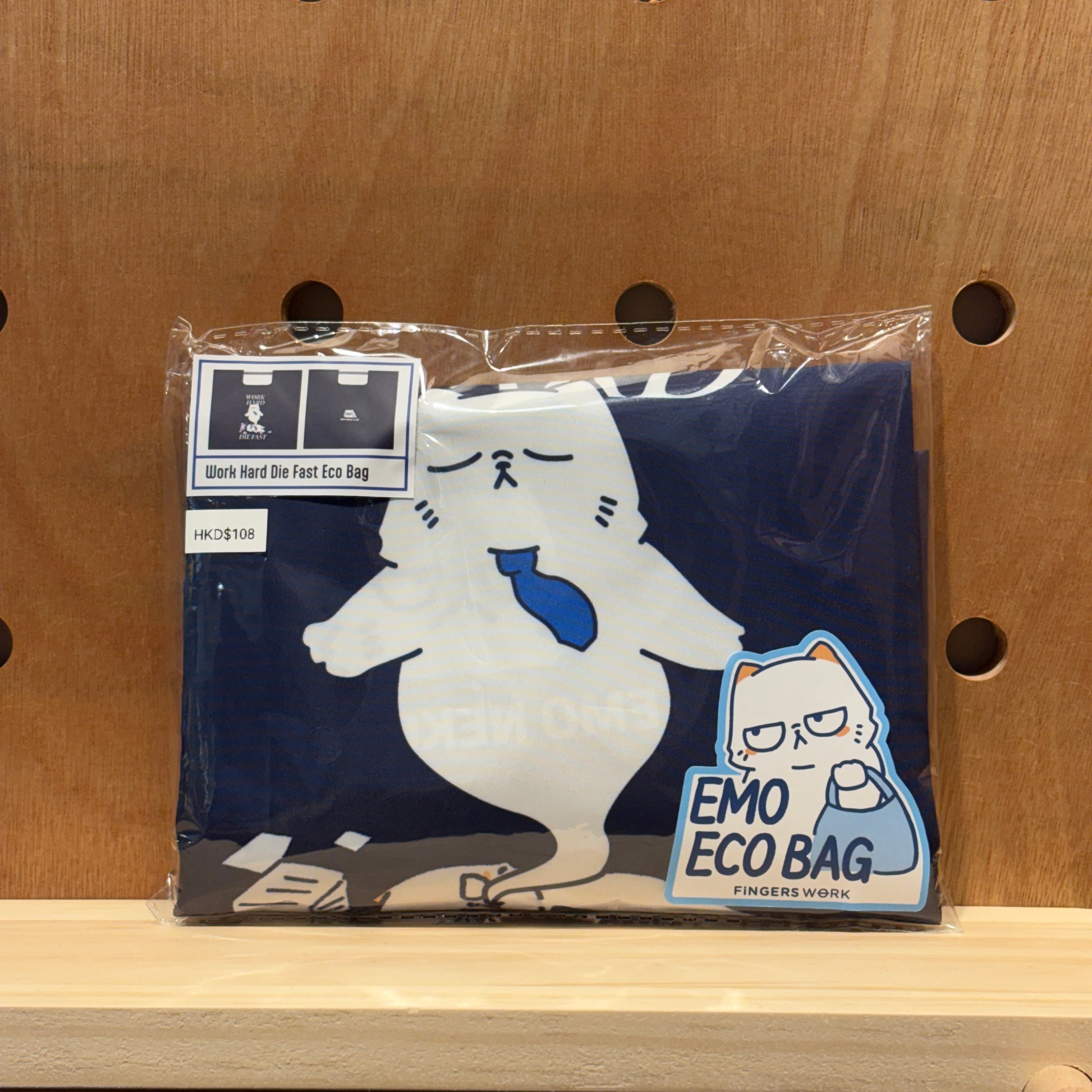 「WORK HARD DIE FAST」,下方還有厭世貓癱軟的插畫形象,